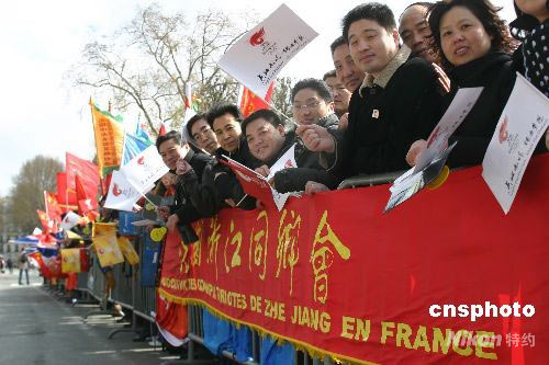 法國當?shù)貢r間4月7日中午,北京奧運圣火在“浪漫之都”巴黎傳遞在巴黎的地標埃菲爾鐵塔拉開帷幕。圖為法國巴黎當?shù)厝A人華僑在埃菲爾鐵塔下迎接奧運圣火。 沈晨 攝