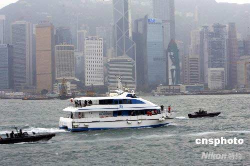 香港舉行北京奧運(yùn)火炬?zhèn)鬟f路線預(yù)演,維港海上數(shù)艘警用巡邏艇、快艇、護(hù)送火炬?zhèn)鬟f游輪過海,消防船在維港射水致意、飛機(jī)空中盤旋護(hù)駕。 王麗南 攝