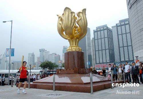 最后一名跑手手持模擬奧運(yùn)火炬順利抵達(dá)終點(diǎn)站--金紫荊廣場(chǎng)。 鄧慶樂(lè) 攝