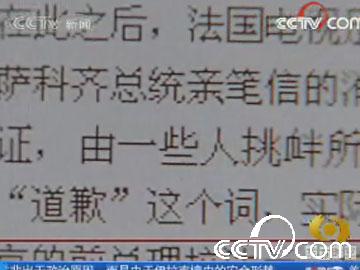 法國(guó)電視足足花了7分多鐘的時(shí)間報(bào)道與中國(guó)有關(guān)的4條消息。首先是法國(guó)參議院議長(zhǎng)向金晶轉(zhuǎn)交薩科齊總統(tǒng)親筆信的消息。破天荒地在屏幕上打出薩卡奇信件的一句關(guān)鍵的話:“我在此向您保證,由一些人挑釁所引起的事件并不反映我的同胞們對(duì)中國(guó)人民的情感”。主持人說(shuō),雖然沒(méi)有明說(shuō)“道歉”這個(gè)詞,實(shí)際上現(xiàn)在是法國(guó)人道歉尋求和解的時(shí)候了。