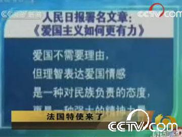 在北京,法國(guó)電視二臺(tái)記者現(xiàn)場(chǎng)調(diào)查抵制家樂(lè)福的呼吁到底有多大影響,詢問(wèn)一位剛從家樂(lè)福出來(lái)的中國(guó)消費(fèi)者對(duì)抵制家樂(lè)福的看法,這位男士一邊往車?yán)镅b采購(gòu)袋一邊說(shuō):“應(yīng)該抵制啊,要是法國(guó)是我們的朋友,為什么巴黎圣火會(huì)出這么多的事”。記者還找到了一位反對(duì)抵制的女士,這位年輕的女子說(shuō):“我反對(duì)抵制,這對(duì)中國(guó)的形象不好”、“賣的好多東西都是中國(guó)產(chǎn)品”。然后鏡頭一轉(zhuǎn),法國(guó)新聞聯(lián)播居然切入了中國(guó)央視新聞聯(lián)播的鏡頭:人民日?qǐng)?bào)發(fā)表文章《愛(ài)國(guó)主義如何更有力》。