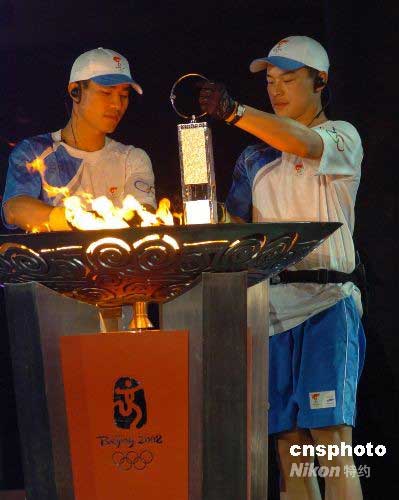 五月三日晚,兩名圣火護(hù)衛(wèi)隊(duì)員在澳門漁人碼頭收回圣火盆中的火種,2008北京奧運(yùn)火炬接力在澳門圓滿結(jié)束。中新社發(fā) 史利 攝