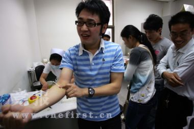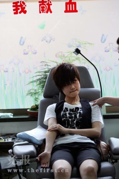 何潔、黃雅莉是約好一起開(kāi)車(chē)到血液中心的,并在車(chē)上填完獻(xiàn)血申請(qǐng)表?吹窖褐行木谷挥羞@么多人在獻(xiàn)血,她們也很激動(dòng),“不知道這么多人都會(huì)來(lái)啊,都是為災(zāi)區(qū),感覺(jué)很感動(dòng)!焙螡嵳f(shuō):“我以前在四川上學(xué),已經(jīng)問(wèn)候了那邊的朋友,他們都很平安。今天是我第一次獻(xiàn)血,感覺(jué)還好吧!蓖瑏(lái)的黃雅莉雖然緊張,但還是很期待:“哎,不就是抽點(diǎn)血嘛,抽完了就好啦!痹诼(tīng)說(shuō)好朋友李宇春也來(lái)獻(xiàn)血時(shí),她們很關(guān)心:“春春暈血,她現(xiàn)在沒(méi)事吧!辈贿^(guò)在進(jìn)入驗(yàn)血室時(shí),剛剛還一副豁出去樣子的黃雅莉卻像孩子一樣跟公司的工作人員說(shuō):“其實(shí)我還是有點(diǎn)緊張哈!”但是她在何潔抽血時(shí),卻不停地給同伴鼓勵(lì):“何潔,別緊張,我支持你哦!”