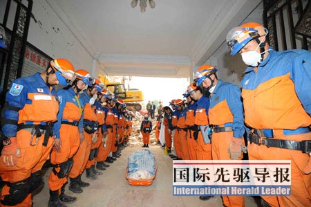 這是足以令每個中國人都為之震撼的一幕!5月17日早晨7點30分左右,四川青川縣喬莊鎮(zhèn)一處倒塌的六層樓廢墟旁,31名全副武裝的日本搜救隊員分成兩列,集體向兩名中國遇難者遺體默哀。經(jīng)過14個小時的努力,他們最終還是沒能挽回這兩條年輕的生命——一名27歲的女性宋雪梅和她剛出生75天的女兒。