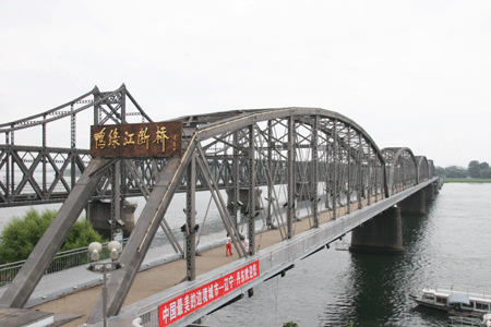 中新網(wǎng)7月2日電 7月1日,2008全國網(wǎng)絡(luò)媒體遼寧行記者采訪團(tuán)來到那曾經(jīng)戰(zhàn)火紛飛的鴨綠江斷橋參觀。鴨綠江端橋為鴨綠江上諸多橋中第一座橋,1909年5月動工,1911年10月竣工。由當(dāng)時日本朝鮮總督府鐵道局所建。始為鐵路橋,12孔,長944.2米。從中方數(shù)第4孔為開閉梁,以4號墩為軸,可旋轉(zhuǎn)90°,便于過往船只航行。