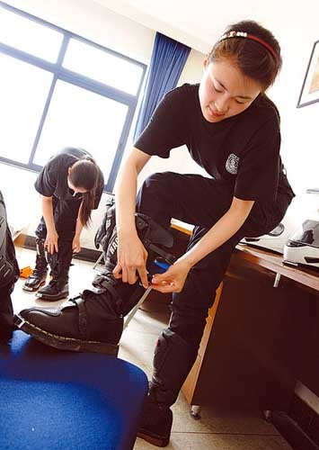 李亞麗穩(wěn)穩(wěn)當(dāng)當(dāng)?shù)伛{著摩托車圍著場地繞了一圈。那些從沒開過摩托車的姐妹們可就沒那么穩(wěn)當(dāng)了。25歲的“警花”甄珍,1米74的個頭,曾在警官樂團(tuán)擔(dān)任打擊樂聲部長,隨團(tuán)出訪日本參加世界警察音樂會。2002年從警校畢業(yè)后分配到車管所工作。性格開朗的她平時喜歡健身、看書、聽音樂。這次被調(diào)入帶路隊,心里甭提多高興了,“騎著摩托車、頭戴耳麥?zhǔn)筋^盔、腳蹬馬靴、全身披掛著直接為奧運會服務(wù),甭提多威武了!笨僧(dāng)她和女隊員們看到眼前這些自重都在500斤以上的大排量摩托車時,卻傻了眼兒。這哪是摩托車呀,簡直是條船。