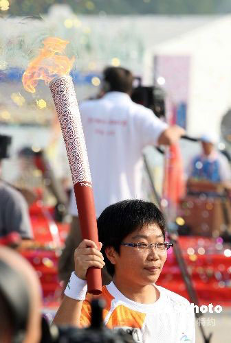 第一棒火炬手、北京市殘疾人體育訓(xùn)練中心和職業(yè)技能培訓(xùn)中心的肢體殘疾者汪涓傳遞火炬。 中新社發(fā) 張宇 攝