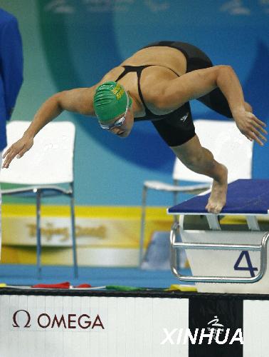 南非著名“獨(dú)腿美人魚”納塔莉•杜托伊特同樣在“水立方”成就了自己的金牌夢(mèng)想。這位“雙奧戰(zhàn)士”在女子100米蝶泳-S9級(jí)、女子100米自由泳-S9級(jí)、女子200米個(gè)人混合泳-SM9級(jí)、女子400米自由泳-S9級(jí)和女子50米自由泳-S9級(jí)中摘得五金,并列北京殘奧會(huì)奪金王。