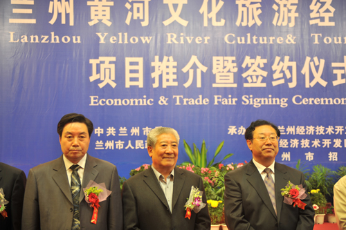蘭州市委書記陸武成(右)、省人大副主任洛桑靈智多杰(中)、蘭州市市長張津梁出席簽約儀式