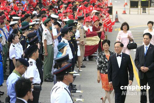 十月一日,香港金紫荊廣場舉行慶祝中華人民共和國成立五十九周年升旗儀式。儀式在八時正開始。香港特區(qū)行政長官曾蔭權(quán)及多名官員出席。中新社發(fā) 張勤 攝