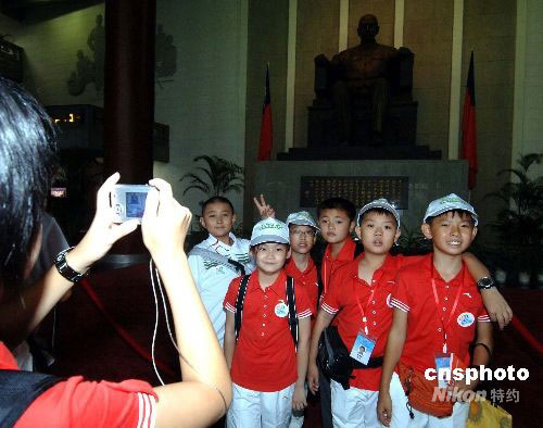 福建小營(yíng)員前往臺(tái)北孫中山紀(jì)念館參觀(guān)并在孫中山塑像前留影。中新社發(fā) 劉可耕 攝