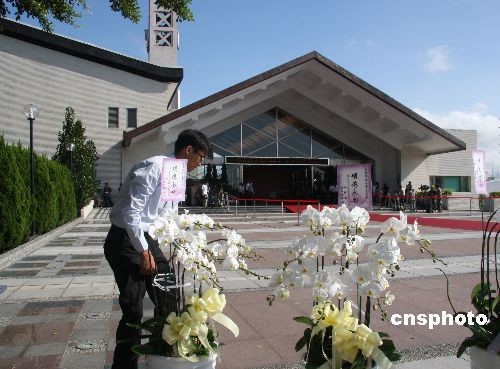 臺塑企業(yè)創(chuàng)辦人王永慶的遺體十七日由長榮班機(jī)運(yùn)抵臺灣,靈堂設(shè)在桃園縣的長庚大學(xué)活動中心。圖為靈堂外景。中新社發(fā) 耿軍 攝