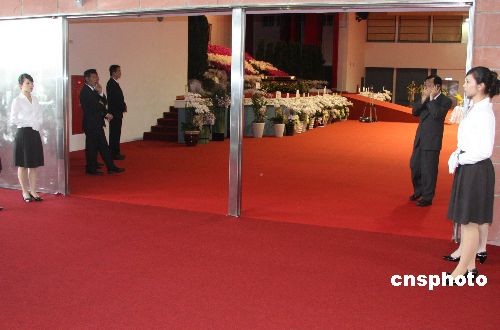 臺(tái)塑企業(yè)創(chuàng)辦人王永慶的遺體十七日由長(zhǎng)榮班機(jī)運(yùn)抵臺(tái)灣,靈堂設(shè)在桃園縣的長(zhǎng)庚大學(xué)活動(dòng)中心。圖為靈堂入口處。中新社發(fā) 耿軍 攝