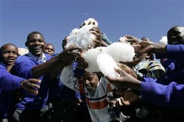 據(jù)《星島日?qǐng)?bào)》消息,在肯尼亞首都內(nèi)羅畢西北200多公里外的一個(gè)鄉(xiāng)村,居民3日早上起床時(shí),發(fā)現(xiàn)草地一夜間鋪上了一層冰雪,很多村民一生都未見過下雪,有人拾起冰塊消暑,亦有人乘機(jī)打雪戰(zhàn)。