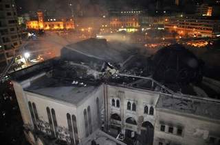 27日,位于開羅市中心的埃及國家劇院突發(fā)大火,消防隊員正在緊急滅火。