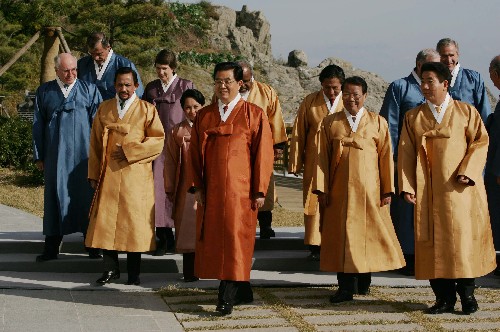 資料圖片:2005年11月19日,國(guó)家主席胡錦濤出席亞太經(jīng)合組織第十三次領(lǐng)導(dǎo)人非正式會(huì)議。圖為胡錦濤主席等亞太經(jīng)合組織成員的領(lǐng)導(dǎo)人身著韓國(guó)民族特色的服裝“圖魯馬吉”合影后,前往出席《亞太經(jīng)濟(jì)合作組織第十三次領(lǐng)導(dǎo)人非正式會(huì)議釜山宣言》的宣讀儀式。樊如鈞 攝