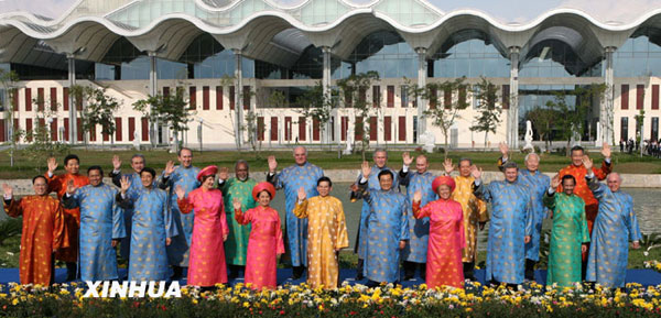 2006年11月19日,亞太經(jīng)合組織各成員領(lǐng)導(dǎo)人身穿越式傳統(tǒng)服裝,集體在越南首都河內(nèi)國(guó)家會(huì)議中心西島合影留念。 新華社記者 樊如鈞 攝