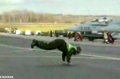 英皇家空軍軍官跑道上邊跳霹靂舞邊指揮飛機起飛