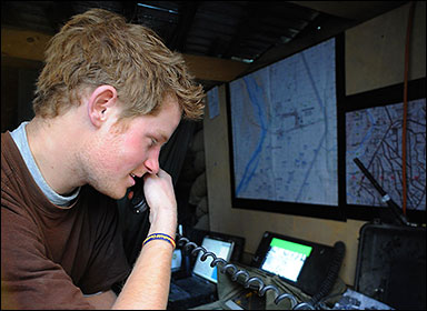 23歲的哈里王子在駐阿英軍第52旅下屬的皇室騎兵團作戰(zhàn)組服役,他在赫爾曼德省邊遠地區(qū)的任務(wù)是協(xié)調(diào)各種飛機的作戰(zhàn)行動,其中包括美國的F-15戰(zhàn)斗機、英國的“鷂”式攻擊機、阿帕奇武裝直升機、 C-130H“大力士”運輸機。他因此要和英國皇家空軍“鷂”式攻擊機女飛行員米歇爾-湯普金斯和她的同事們保持經(jīng)常性的接觸,飛行員只有在獲得他的批準后才能對目標發(fā)動攻擊。