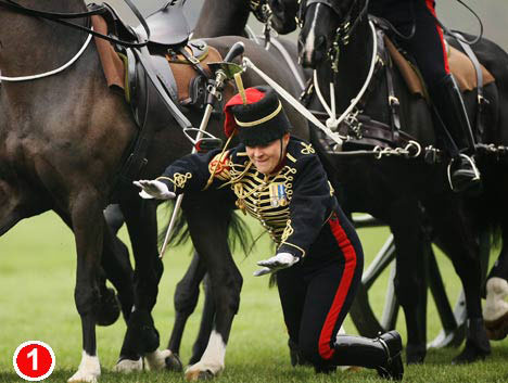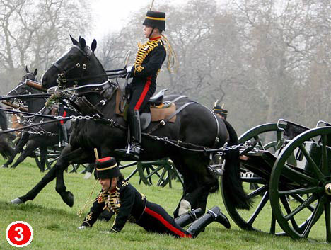 21日當(dāng)天,英國皇家騎兵團(tuán)的成員攜禮炮向海德公園進(jìn)發(fā),一路上不少民眾擠在道路兩旁觀看。忽然一名年輕的女炮手跌身下馬,眾目睽睽之下,她慌忙環(huán)視四周并立即翻身上馬,以保證隊(duì)列安全行進(jìn)。英國《每日郵報》的記者眼疾手快,將女炮手摔下馬的情景搶拍了下來。(梁陳聰)