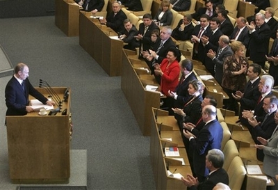 普京當日在國家杜馬發(fā)表演說,闡述他在經(jīng)濟和軍事方面的施政要點。