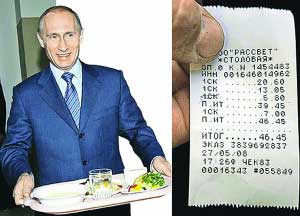 參觀結(jié)束后普京決定到汽車公司職工食堂吃午飯。雖然身為總理,普京卻自己拿著塑料托盤,和普通工人一樣排隊(duì)買飯。在柜臺(tái)前,他給自己點(diǎn)了一份面條湯、一份牛肉片、一份蔬菜色拉、一份米飯、一塊餡餅和一杯茶,一起只要57盧布,約合人民幣16塊8角。