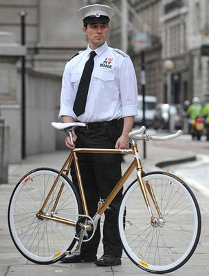 這輛自行車受英國(guó)環(huán)境運(yùn)輸協(xié)會(huì)委托定制而成,鏈條、座位、車把手都和普通自行車的一樣,不過表面卻鍍上了24克拉的黃金。由于在英國(guó),售價(jià)超過4000英鎊的自行車都不能享受保險(xiǎn)“待遇”,因此購(gòu)買這輛自行車的人還必須雇一位“保鏢”,在公共場(chǎng)合負(fù)責(zé)看管。