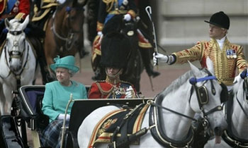 據(jù)英國廣播公司報(bào)道,按照傳統(tǒng),女王夫婦搭乘開敞篷馬車抵達(dá)白金漢宮邊上的馬隊(duì)校閱場。王儲(chǔ)查爾斯王子和安妮公主則率馬隊(duì)跟隨。