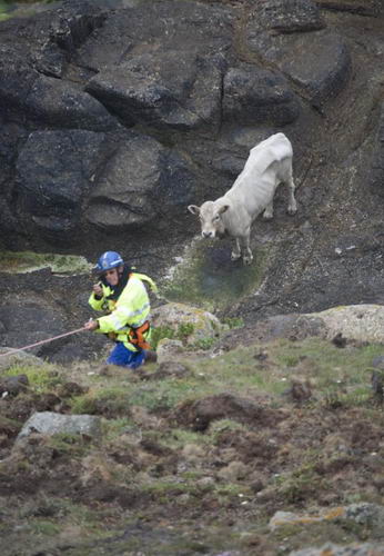 順繩索下到山澗的海岸警衛(wèi)隊(duì)員給公牛帶來了食物和水。