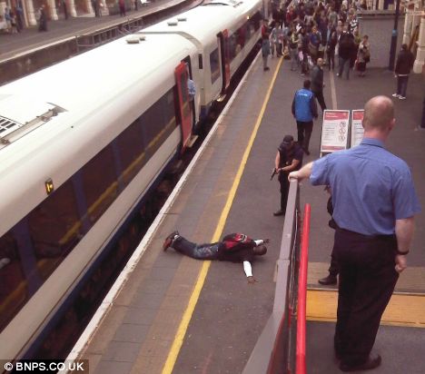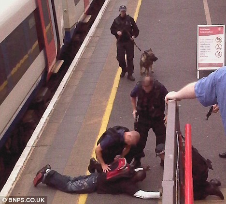 就在英國(guó)警方抓捕這名無(wú)辜男子時(shí),一名在現(xiàn)場(chǎng)的乘客使用手機(jī)拍下了有關(guān)過(guò)程。有目擊者對(duì)記者說(shuō),“當(dāng)時(shí)有很多人都在排隊(duì)買(mǎi)票,但突然有多名全付武裝的警察沖進(jìn)車(chē)站,他們的人數(shù)大約有10個(gè)人,有些警察拿著手槍?zhuān)硗膺有一條警犬。我聽(tīng)見(jiàn)有人說(shuō):不要讓任何人走下火車(chē)或者離開(kāi)站臺(tái)。隨后火車(chē)站所有的出口都被封鎖了;疖(chē)的車(chē)門(mén)打開(kāi)后,那名男子剛一走下站臺(tái),就被命令趴在地上,他被要求伸開(kāi)雙手并靠攏雙腿。警方對(duì)這名男子的背包進(jìn)行了認(rèn)真的搜查,然后又把他帶到一間廢棄不用的盥洗間,可能是對(duì)他進(jìn)行一步的搜查。這一幕真是讓人感到非?植!