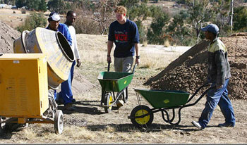 身穿體恤衫、斜紋棉布褲,腳穿結(jié)實膠鞋的哈里,像其他人一樣,手推獨輪車,耐心排隊等候裝水泥,然后經(jīng)過崎嶇不平的地形,將水泥倒進新建學校的基槽中。他還幫忙挖溝,修建特殊學校有利于殘疾兒童出入的斜坡。戴上口罩和護目鏡,哈里王子還能用錘子將鋼釘釘進學校食堂頂棚的木板中。