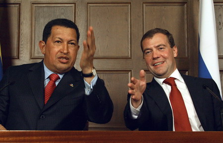 委內(nèi)瑞拉總統(tǒng)查韋斯(左)與俄羅斯總統(tǒng)梅德韋杰夫(右)