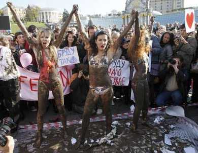 中新網(wǎng)10月20日電 綜合報(bào)道,一個(gè)名為“Femen”的烏克蘭青年組織19日走上基輔街頭,表演泥漿摔跤節(jié)目,以抗議“骯臟的政治和選舉技術(shù)”。女青年希望以這一方式吸引人們的注意,加入抗議提前議會(huì)選舉的行列。