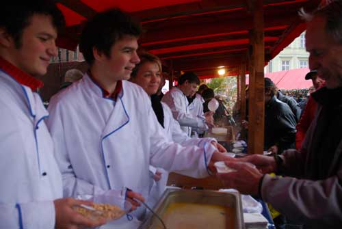 6年來布拉格市長貝姆第一次沒有親自操勺打湯,據(jù)說這位跑過馬拉松,登過珠峰的運動愛好者人在南極,他的太太拉德米拉.貝娃帶著兩個兒子為市民服務,向每一位領湯的人轉達她丈夫的節(jié)日問候。