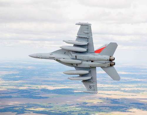 由波音公司生產(chǎn)的EA─18G“咆哮者”電子作戰(zhàn)高性能戰(zhàn)機,是屬于FA─18“大黃蜂”型戰(zhàn)機的改良型先進戰(zhàn)機。EA─18G“咆哮者”可以攜帶反雷達空地導彈的電子作戰(zhàn)軍機,能夠在極短的距離內(nèi)起飛降落,同時有干擾敵方雷達與電子裝備的能力。美軍在伊拉克就是使用舊版“咆哮者”來干擾路邊炸彈的引爆訊號。