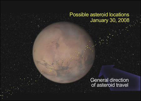 美國宇航局上月21日發(fā)布觀測結(jié)果說,一顆名為2007WD5的小行星本月末將穿越火星繞日軌道,其間小行星有可能與火星碰撞。
