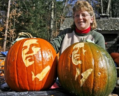 今年恰逢美國大選年,美國總統(tǒng)候選人奧巴馬和麥凱恩的造型受到了南瓜雕刻愛好者的追捧。另外,還有美國商家趁機(jī)雕刻了上千只造型各異的南瓜,等待萬圣節(jié)時(shí)擺上柜臺。