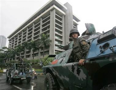 中新網(wǎng)11月29日電 綜合報道,曾發(fā)動兵變的菲律賓士兵29日占領馬尼拉半島酒店,要求總統(tǒng)阿羅約辭職。政府給予那些士兵的投降限期已屆滿。政府此前要求這些士兵在北京時間下午3點無條件投降。
