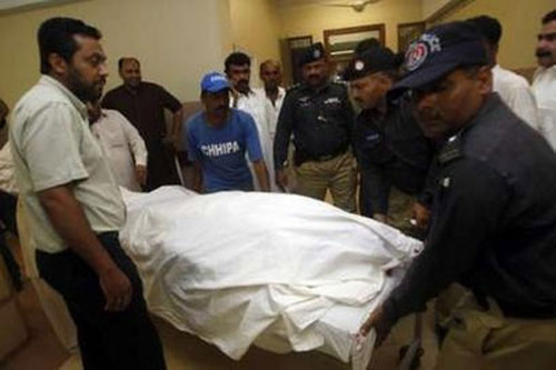 5月23日晚,巴基斯坦穆斯林聯(lián)盟(謝里夫派)副主席塔里克·漢在卡拉奇遭不明身份人員槍擊身亡,圖為警察在轉(zhuǎn)運(yùn)尸體(國際在線配圖)