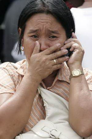 “群星公主”號渡輪乘客和船員親屬在宿務(wù)等待消息時對蘇爾皮西歐船運公司的雇員尖叫。一位婦女對該公司的一名雇員稱:“你無法讓我們的親人回來,你應(yīng)當對此負責!碧K爾皮西歐船運公司稱,它將向每位遇難者的家屬支付20萬比索(4500美元)的賠償,向幸存者支付一定數(shù)量的金錢。(黃歡)