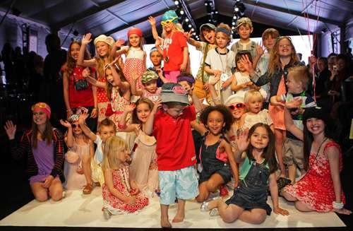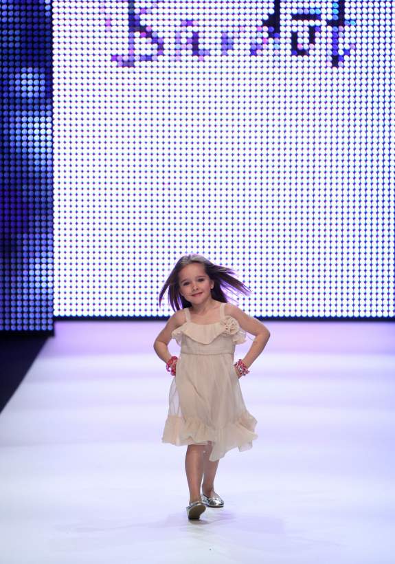 當(dāng)日,小模特在T臺(tái)上展示童裝為時(shí)裝周開幕。