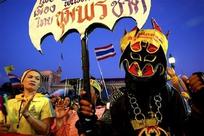 泰國(guó)的反政府示威者誓要推翻總理沙馬政府,對(duì)于緊急狀態(tài)令都嗤之以鼻,他們相信泰王受到威脅,愿為泰王而死。