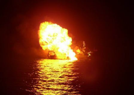 圖片顯示,“塔巴爾”號的海軍官兵動用艦上的A-190“美洲豹”100毫米艦炮向海盜母船開火,海軍母船中彈起火。