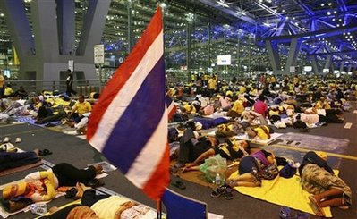 據(jù)悉,約2000名示威者闖入新國際機(jī)場客運大樓的離境大堂,泰國機(jī)場公司宣布在當(dāng)?shù)貢r間25日晚上9時起暫時關(guān)閉機(jī)場,準(zhǔn)備在機(jī)場降落的航機(jī)要轉(zhuǎn)飛清邁、布吉和其它地區(qū)的機(jī)場,數(shù)以千計旅客滯留。