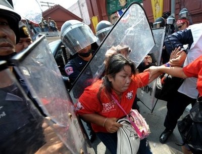 示威者投擲鐵欄泄憤,有人用磚砸爛議員的汽車,防暴警察組成人鏈,防止示威者沖擊。一名記者鼻梁被石擊中,一名防暴警察頭部也受傷,警方一度要增援。示威者其后散去。據(jù)報,他信的支持者亦在東北部多個省分示威,抗議阿披實當選。