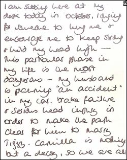 戴安娜在信中寫到,“我現(xiàn)在坐在這里,希望有人能來(lái)抱抱我,鼓勵(lì)我保持堅(jiān)強(qiáng),昂起我的頭顱。我生命現(xiàn)在處在一個(gè)非常危險(xiǎn)的時(shí)期,我的丈夫想要制造一起‘車禍’謀殺我,比如剎車失靈然而引起頭部重傷等等。只有這樣他才能為自己與堤姬(查爾斯與戴妃離婚后專門負(fù)責(zé)照顧哈里和威廉的保姆)成婚掃清障礙?桌贿^(guò)是個(gè)誘餌,而我們兩人都是被他利用了!