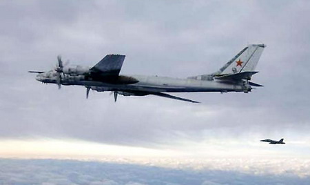 英報公布美F/A-18戰(zhàn)機(jī)跟蹤俄圖-95轟炸機(jī)圖片(圖)