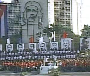 哈瓦那人山人海,廣場上可以看到馬克思、恩格斯和列寧的肖像,還有當(dāng)年古巴游擊隊(duì)領(lǐng)導(dǎo)人切·格瓦拉的大幅圖像。