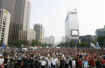 面對各方壓力,韓國政府已宣布推遲執(zhí)行開放牛肉協(xié)議;李明博的7名高檔秘書亦于上周五集體提交辭呈,以表示承擔(dān)責(zé)任,但仍未能平息風(fēng)波,反對派昨晚發(fā)起全國100萬人大示威,其中70萬人走上首爾街頭,但警方指示威者只有8萬人,而當(dāng)?shù)貍髅焦烙嬘?0萬至40萬人。當(dāng)局調(diào)動3.7萬名防暴警察戒備,其中2萬人部署在首爾。
