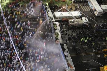 6月28日,韓國(guó)警方再次動(dòng)用高壓水龍驅(qū)散大批示威者。